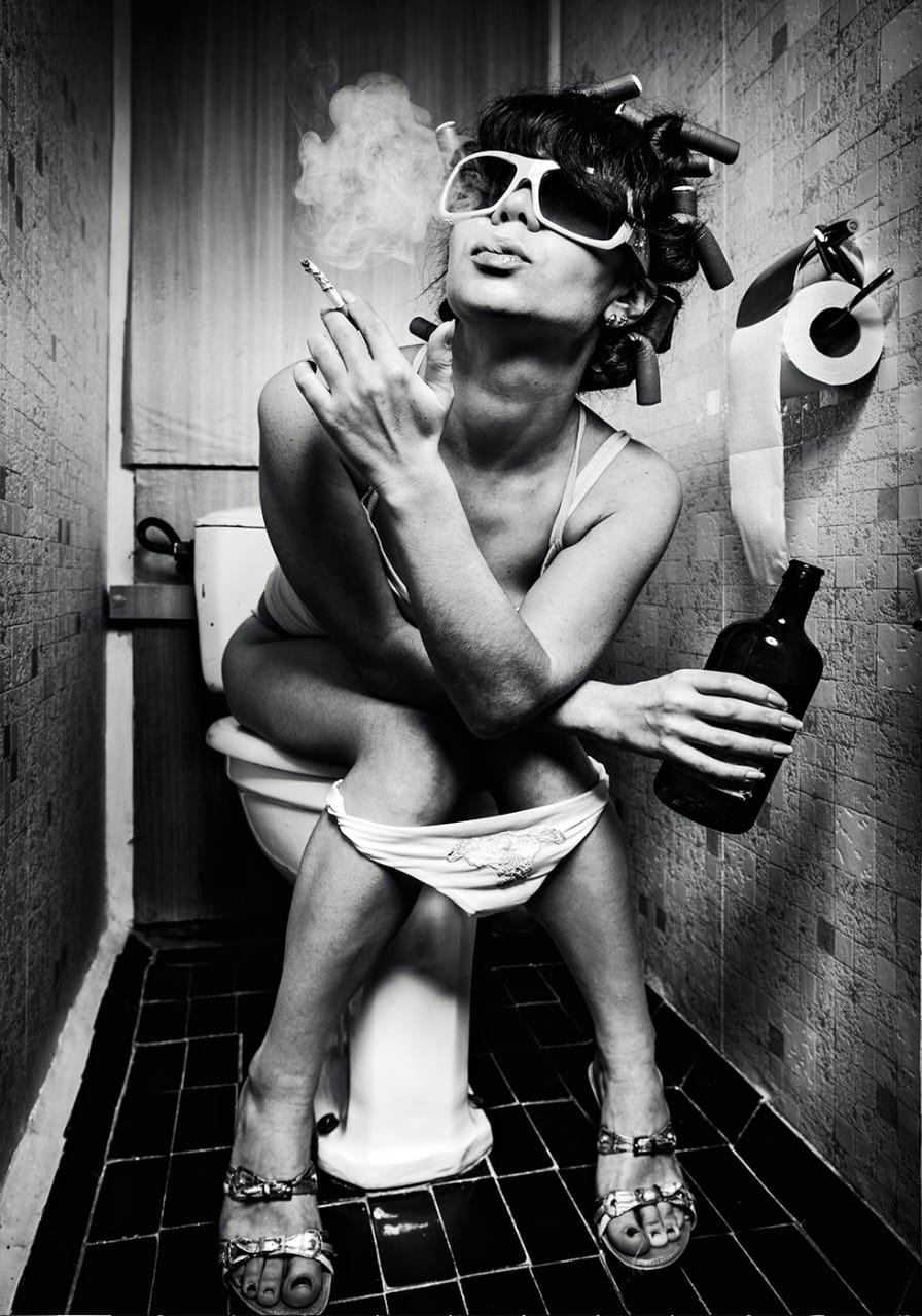 Pozoruhodná černobílá fotografie, která mísí humor a odvahu. Snímek zobrazuje ženu na toaletě s vintage natáčkami, nadměrnými slunečními brýlemi a sebevědomým postojem. Drží cigaretu a lahev, což symbolizuje vzdorovité sebevyjádření. Toto hravé a nekonvenční umělecké dílo je ideální pro eklektické bytové dekorace nebo pro ty, kteří oceňují svérázné a rebelské obrazy.
