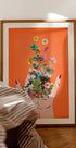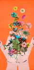 Živé a nápadité umělecké dílo s rukama uvolňujícími barevné květiny a listy na výrazném oranžovém pozadí. Digitální koláž spojuje přírodu a figurativní umění a vytváří poutavou květinovou ilustraci, která symbolizuje svobodu, kreativitu a krásu.