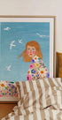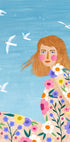 Rozmarná a barevná ilustrace ženy zabalené do květinového pláště proti jasné modré obloze. Dílo obklopené létajícími ptáky evokuje svobodu, radost a svěžího ducha jara. Legendární, ale také klidný, spojuje přírodu a fantazii v živém moderním stylu.