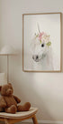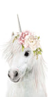 Snová a pohádková ilustrace jednorožce zdobená jemnými pastelovými barevnými květy. Bílé pozadí zdůrazňuje magickou a jemnou náladu tohoto nápaditého uměleckého díla. Ideální do dětských pokojů, ústavů nebo pro každého, kdo miluje mýtické kouzlo.