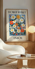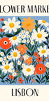 Okouzlující retro plakát s kopretinami, máky a divokými květinami v teplých oranžových, bílých a žlutých odstínech na modrém pozadí. Toto umělecké dílo, inspirované pulzujícími lisabonskými květinovými trhy, zachycuje evropskou cestovatelskou nostalgii a botanickou krásu.