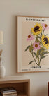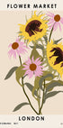 Okouzlující květinový plakát se zlatými slunečnicemi a jemnými růžovými květy. Toto moderní umělecké dílo inspirované vintage oslavuje květinovou nádheru Londýna a živou atmosféru léta.