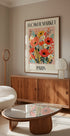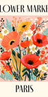 Okouzlující plakát ve vintage stylu se zářivými máky, divokými květinami a jemnými pastelovými barvami. Plakát oslavuje eleganci pařížských květinových trhů a kombinuje retro estetiku cestování s botanickou krásou.