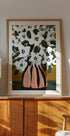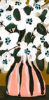 Odvážné a elegantní květinové zátiší s bílými květy v pruhované růžové váze. S půvabem inspirovaným vintage a pastelovými barvami, umělecké dílo vyvažuje moderní grafický styl s botanickou jemností, perfektní jako dekorace v moderních a stylových interiérech.