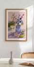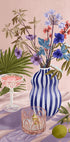 Toto živé umělecké dílo zátiší obsahuje pruhovanou vázu s barevnými květinami obklopenou tropickými listy a sklem na texturovaném povrchu. Kompozice vytváří harmonický mix přírody a moderní estetiky a dodává jak svěžest, tak eleganci každé místnosti.