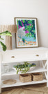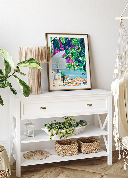 Živá pocta Lisabonu: sluncem zalité fasády, květiny v oknech a množství barevných domů, které postupně padají k modrému moři. Volné tahy štětcem a impresionistická nálada zachycují pulzující energii města. S výhledem na kopce a střechy, zalité teplými barvami. Vytvořil Pauline Wegman | Key and Sea Creative.