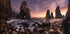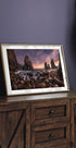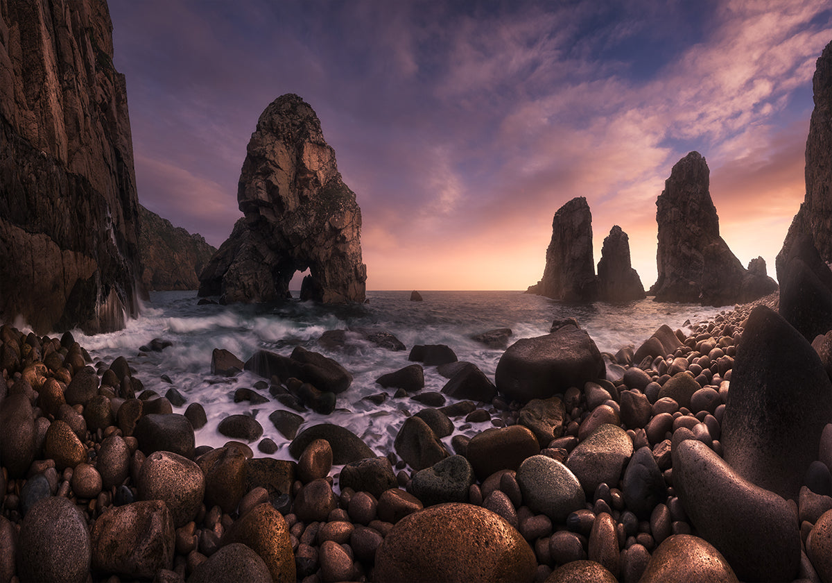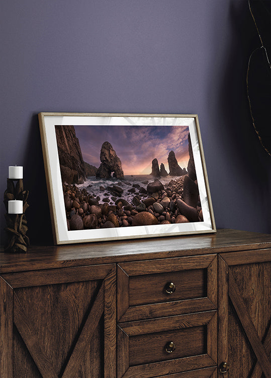 En gylden solnedgang farver Atlanterhavet ved Louriçal på Portugals vilde Sintra-Cascais-kyst. Mægtige klipper og naturlige stenbuer rejser sig af skummet, mens bølgerne ruller over runde småsten i forgrunden. Carlos F. Turienzo fanger dramatikken og roen i et tidløst kystlandskab. Horisonten gløder i lilla og rav, mens himlen spejler havets rytme.