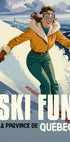 Cestovatelský plakát inspirovaný retro Andreasem Magnussonem: Dynamický lyžař v barevné bundě se prodírá prašanem po sjezdovce, zatímco v pozadí se tyčí majestátní quebecké hory a tmavé borové lesy. Jasné, grafické tvary a tlumené vintage barvy zachycují svěží severskou zimní náladu na dobrodružství.