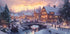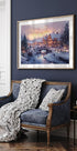 Atmosférické vánoční město se rozvíjí v měkkém sněhu, kde jemné sněhové vločky padají na útulné domy a borovice. Lidé se pohybují mezi světlými okny a zšeřelými ulicemi, zatímco tahy štětcem dodávají tématu malebné, nadčasové kouzlo. Ideální pro zachycení tepla v chladné záři zimy. Pověste ho v obývacím pokoji pro útulnou vánoční atmosféru.