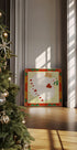 Send warm holiday wishes with this joyful illustration by Dirkie Nell: a graceful white dove glides across a bold red backdrop, carrying a sprig of mistletoe and trailing playful hearts. Retro-boho details and charming hand-drawn lettering spell out Merry Christmas in uplifting style. Perfect for cozy winter decor and heartfelt gifting.