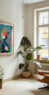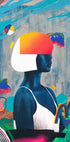 Nápadné umělecké dílo z různých médií představující modrou ženu s odvážným abstraktním účesem v zářivých barvách. Práce kombinuje graffiti, tahy štětcem a kolážové prvky, aby vytvořila silný, moderní výraz současného street artu.
