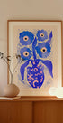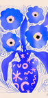 Odvážná a hravá pocta Matisse s živou vázou plnou nápadných modrých květů na světlém pozadí. Design kombinuje grafické vzory s květinovými prvky a vytváří živé a moderní zátiší, ideální pro současné interiéry.