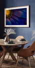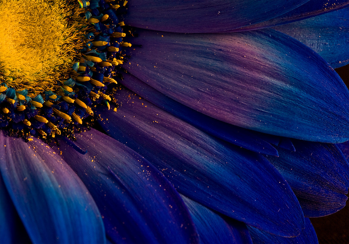 Úchvatná makrofotografie květiny v tmavě modrých a fialových odstínech se zářivě žlutým středem. Jemné detaily v okvětních lístcích, pylu a texturách vytvářejí intimní a umělecký detail, který vyzařuje eleganci a letní teplo.