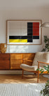 En grafisk hyldest til byens rytme: Greetje van Son indfanger en Mondrian-inspireret facade med stramme linjer, klare primærfarver og et præcist grid. Kompositionen forener arkitektur og abstraktion, hvor røde, gule, blå og hvide felter spiller op mod sorte linjer – et moderne kig på Holland. Inspireret af Amsterdam og Bauhaus’ klare formsprog.
