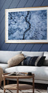 Ledově modrá řeka se protíná zasněženou krajinou při pohledu ze vzduchu, kde mrazivé stopy kreslí jasné linie mezi tmavými stromy a bílými plochami. Chladivá paleta a klidný rytmus křivek zachycují tichou intenzitu zimy. Photo art Daniela Gastagera, který vyvažuje syrovou přírodu a poetický klid. Vytváří hloubku a klid v místnosti.