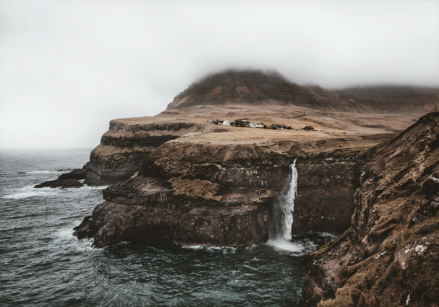 Kultovní vodopád Múlafossur se elegantně řítí do Atlantského oceánu, obklopený dramatickými útesy a okouzlující vesnicí na větrem ošlehané náhorní plošině na Faerských ostrovech. Nízko položené mraky zahalují hory a dodávají tomuto odlehlému místu podmanivou krásu.