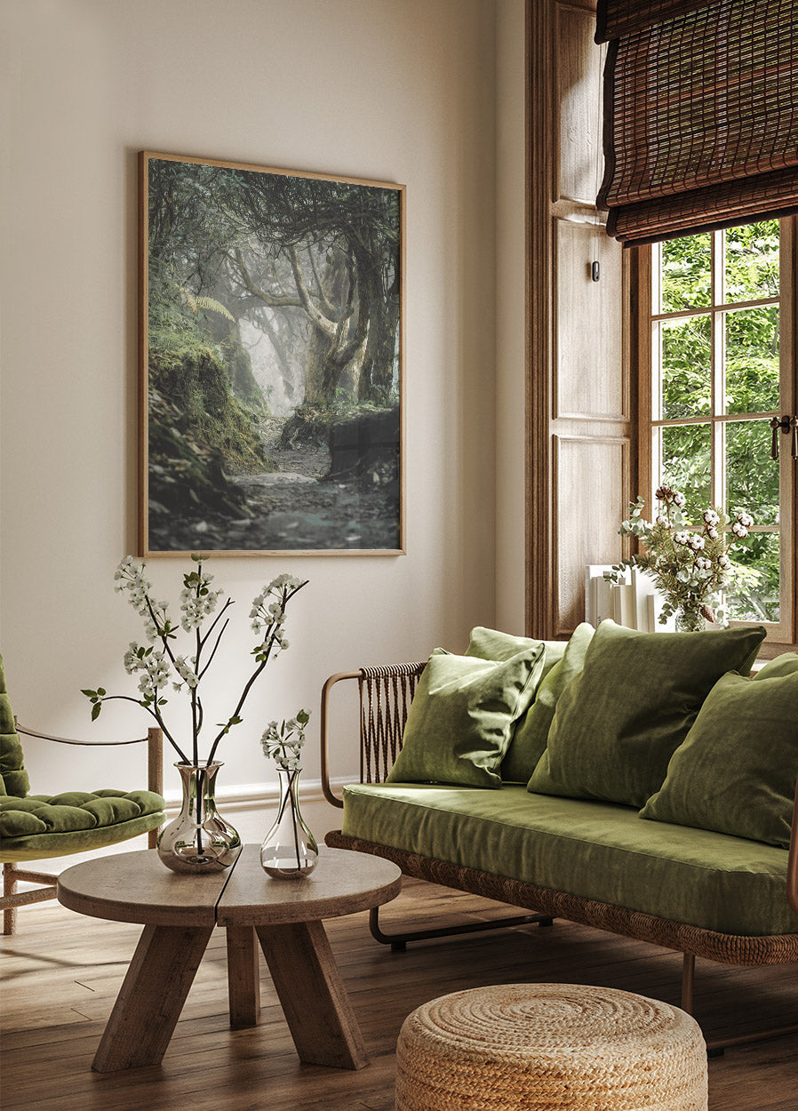 Plakát, který zachycuje magickou a tajemnou atmosféru lesa, je ideální pro dodání snové a atmosférické atmosféry do každé místnosti, ideální pro ty, kteří milují pohádkovou přírodu.