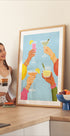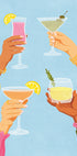 Živá a barevná ilustrace, která oslavuje přátelství a radost. Čtyři ruce zvedají své koktejlové sklenice ve veselé misce na jasně modrém pozadí, plném tepla, pozitivity a komunity – ideální pro moderní kuchyně, bary nebo obývací pokoje.