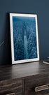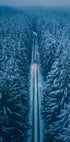 Osamělá zimní cesta protíná temný borový les, zahalený v mlze a namodralé záři. Daleko vpředu světlomety aut narušují ticho a vedou zrak k obzoru, kde se potkává sníh a mlha. Pevná symetrie a melancholický klid zachycují touhu po cestě. Autor fotografie Oskar Ulvur. Ideální pro ty, kteří milují klidnou zimní krajinu.