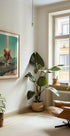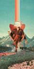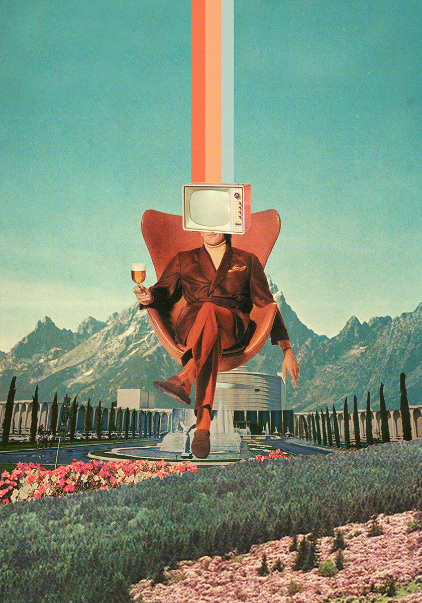 Surrealistická digitální koláž muže v retro oblečení sebevědomě sedícího v oranžovém křesle se sklenkou vína v ruce. Jeho hlavu vystřídá stará televize, která na oblohu promítá barevné pruhy. Scéna kombinuje futuristickou architekturu, horské krajiny a květinové detaily a vytváří osobitý mix retro nostalgie a surrealistické fantazie.