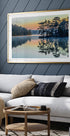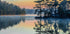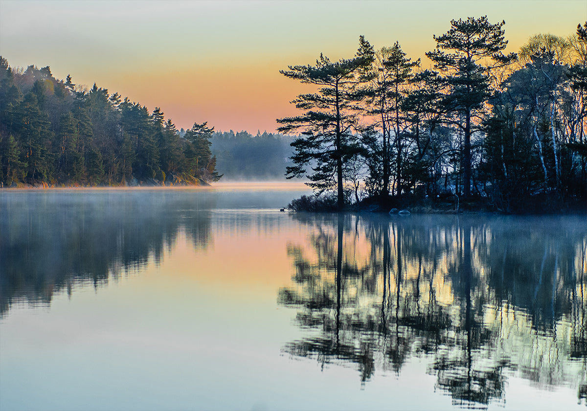 Poklidná scéna jezera za úsvitu zachycená ve Švédsku s mlhou stoupající nad stojatou vodou. Odraz borovic září v měkkém slunečním světle a vytváří klidnou a meditativní atmosféru plnou klidu a harmonie.