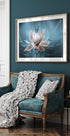 Tato elegantní makrofotografie zachycuje jemnou květinu v jemných bílých a modrých odstínech, zvýrazňující žilky okvětních lístků a lesknoucí se kapky rosy. Snová nálada a detailní detailní záběry vytvářejí sofistikované a uklidňující umělecké dílo, které je ideální pro moderní botanickou obrazovou stěnu.