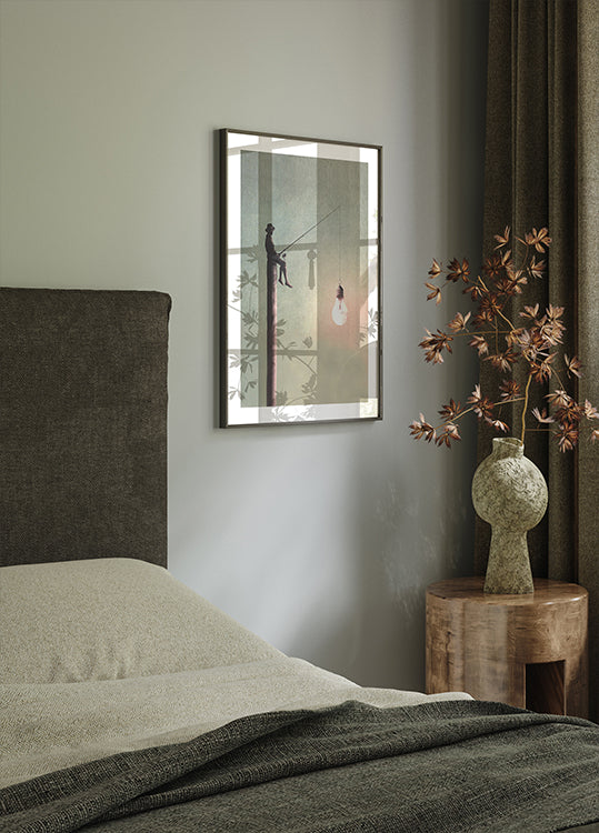 Surrealistický a podnětný umělecký plakát zobrazující osamělého rybáře sedícího na prutu, jak loví zářící žárovku. Tento nápaditý motiv symbolizuje kreativitu, inspiraci a hledání nových nápadů – ideální pro pracovní prostor nebo kreativní prostředí.