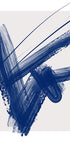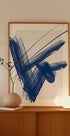 Plakát moderního abstraktního umění se silnými modrými tahy štětcem na světlém pozadí. Dynamické tahy vytvářejí pohyb a texturu, což z něj činí nápadně minimalistické dílo, ideální pro moderní interiéry.