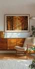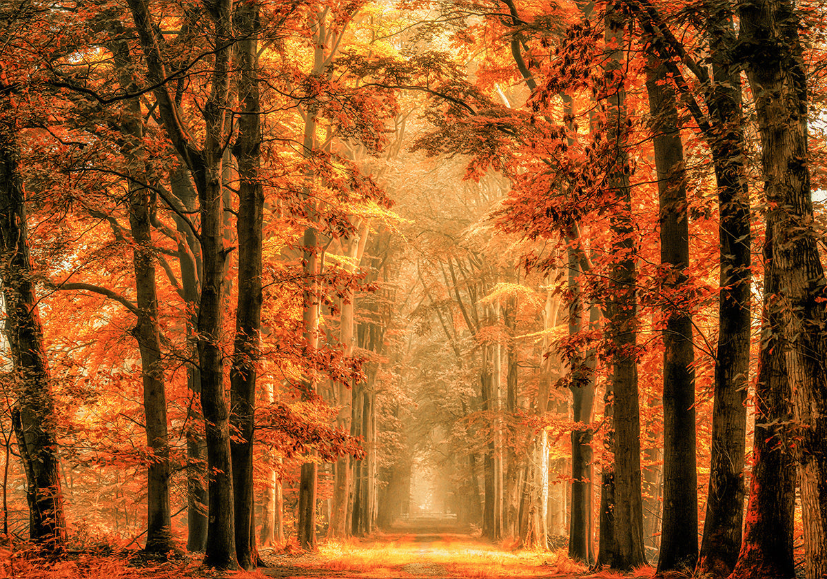 Úchvatná podzimní lesní stezka zářící zlatým světlem, kde vysoké stromy tvoří přirozený tunel, který působí jako magická brána. Scéna vyzařuje teplo, tajemno a krásu podzimu a zve diváka na dobrodružnou cestu.