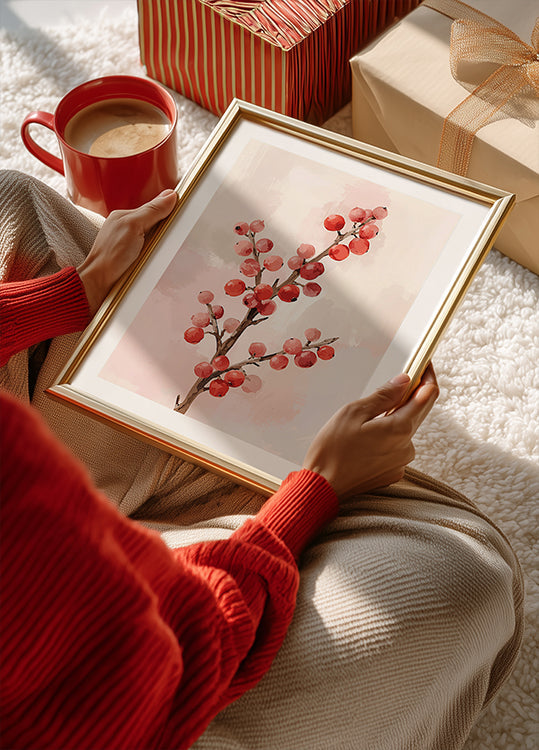 Roter Beerenzweig zachycuje poezii zimy: elegantní větev se sytě červenými bobulemi, která ostře vyniká na jemném, pastelově tónovaném pozadí. Klidná kompozice a tlumené barvy dodávají severský, minimalistický výraz, který vytváří vánoční atmosféru bez hluku - ideální pro útulnost, předsíň nebo obývací pokoj. Dotek přírody, který se hodí do moderních i klasických pokojů.