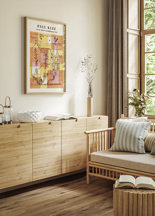 Podmanivá kompozice Paula Kleeho z roku 1921, inspirovaná tajemným a surrealistickým světem ETA Hoffmanna. Toto abstraktní dílo kombinuje geometrické tvary s hravými organickými liniemi a vytváří tak snovou architektonickou krajinu. S teplými tóny okrové, broskvové a jemné růžové toto umělecké dílo představuje Kleeho charakteristické spojení představivosti a struktury – ideální doplněk do sbírky moderního umění.
