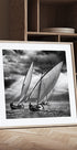 Dramatická, jednobarevná scéna plavby: flotila elegantních plachetnic se prodírá mořem, zatímco paprsky slunečního světla prorážejí těžké mraky a třpytí se na vlnách. Klidná síla a rytmus regaty zachycuje pocit svobody – vytvořil ji fotograf Angel Villalba. Nadčasový motiv pro námořní domy a moderní stěny.