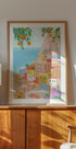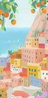 Barevná ilustrace pobřeží Amalfi, kde pastelově zbarvené domy padají z útesů směrem k tyrkysovému moři. Dílo orámované pomerančovníky a květinami zachycuje podstatu italského léta – slunečnou architekturu, středomořské kouzlo a radost z cestování a dovolené.