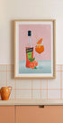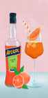 Svěží a živá ilustrace Aperol Spritz s lahví, citrusovými plody a koktejlovou sklenicí s ledem a pomerančovou oblohou na jemném růžovém pozadí. Legendární a barevné, toto umělecké dílo zachycuje podstatu italského léta a aperitiv kultury, ideální pro kuchyně, bary a společenské prostory.