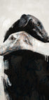 Expresivní digitální malba dvou chrtů v láskyplném objetí, jejichž těla se překrývají v něžné póze. Umělecké dílo kombinuje realistické psí portréty s abstraktními tahy štětcem a květinovými detaily, čímž vytváří harmonickou rovnováhu mezi emocemi a uměním. Dojemný kousek, který symbolizuje lásku, připoutanost a přátelství.
