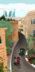 Barevné ilustrace vozů Formule 1 projíždějících historickými ulicemi Baku v Ázerbájdžánu. Umělecká díla spojují kouzlo staré architektury s moderním panoramatem s ikonickými Flame Towers v pozadí. Dynamické dílo, které zachycuje rychlost, kulturu a vzrušení Velké ceny Baku.