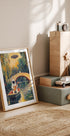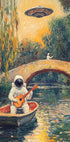 Surrealistický impresionistický obraz astronautů v zemité krajině. Astronaut sedí ve člunu a hraje na kytaru, zatímco jiný gestikuluje z kamenného mostu pod zlatým nebem. Nad nimi se vznáší UFO, které kombinuje sci-fi s historií umění v humorné a nápadité scéně.