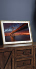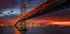 Úchvatný noční pohled na sanfranciský Bay Bridge nasvícený teplými zlatými tóny proti zářícímu panoramatu města. Dramatická obloha za soumraku a odrazy ve vodě vytvářejí působivou panorámu města, ideální pro milovníky města, cestovatele a moderní interiéry.