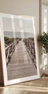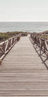 Klidná pobřežní fotografie zobrazující dřevěnou promenádu vedoucí přímo dolů k šumivému moři. Perspektiva úběžníku zve diváka k procházce k horizontu a navozuje pocity klidu, volnosti a ticha léta.