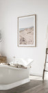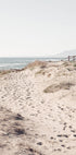 Klidná pobřežní fotografie ukazující písečnou cestu dolů k moři. Měkké stopy v písku, divoká plážová tráva a vlny moře v dálce vytvářejí klidnou a nostalgickou atmosféru. Ideální pro vnesení letního klidu do každé místnosti.