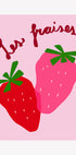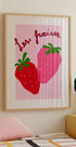 Hravý a živý jahodový plakát s výraznými červenými a růžovými odstíny a ručně psaným francouzským textem "Les fraises". Ideální pro retro kuchyňskou výzdobu, valentýnskou inspiraci nebo pro každého, kdo miluje ovocné umění.
