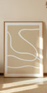 Uklidňující, minimalistický plakát s plynulými bílými linkami na béžovém pozadí. Abstraktní kompozice vyzařuje jednoduchost, harmonii a eleganci, díky čemuž je nadčasovým kouskem do moderních interiérů.