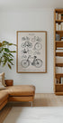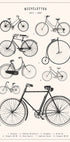 Detailní černobílá ilustrace historických kol od roku 1871 do roku 2007. Toto nostalgické umělecké dílo zachycuje historii jízdního kola s ikonickými modely jako Kenwood, Columbia a Grand Bi. Ideální pro domácnost, obchody s koly nebo pro přidání retro šarmu na stěnu galerie.