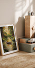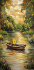 Vtipný parodický kousek, který kombinuje klasický styl olejomalby s popkulturou. Scéna ukazuje kreslenou postavičku, jak poklidně rybaří v dřevěné lodi obklopené bujnými stromy a zářící řekou. Hravý mix přírody a surrealistického humoru, ideální pro fanoušky svérázného nástěnného umění.