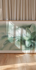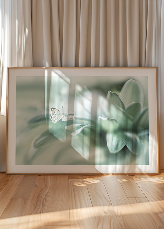 Jemná makrofotografie motýla, který jemně odpočívá vedle jiskřivé kapky vody na měkkých zelených okvětních lístcích. S pastelovými barvami a snovým rozmazaným pozadím zachycuje toto umělecké dílo křehkost, čistotu a tichou krásu přírody.