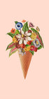 Surrealistický a hravý umělecký plakát s kyticí zářivých vintage květin uspořádaných do kornoutu zmrzliny na měkkém broskvově růžovém pozadí. Tato jedinečná umělecká koláž spojující přírodu a nostalgii je dokonalým doplňkem pro moderní, retro a eklektické interiéry.