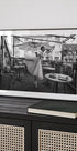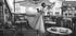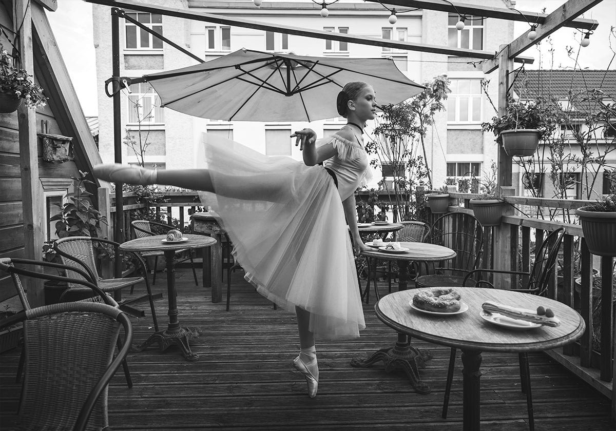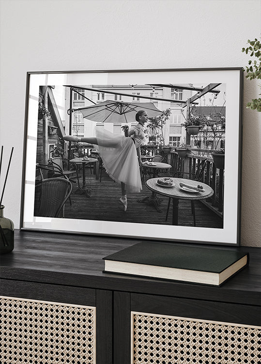 Na této elegantní černobílé fotografii pózuje půvabná baletka na terase kavárny. Spojení tance, architektury a městského života v kavárně vytváří poetické a nadčasové umělecké dílo.