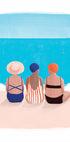Jasná a šťastná ilustrace tří žen, které spolu sedí u moře a užívají si slunce a výhled. Dokonalé umělecké dílo, které do vašeho domova přinese pocit dovolené, relaxace a letní atmosféry z pobřeží.