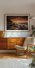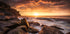 Ohromující přímořská krajina na Cape Solander, Sydney, zachycená při východu slunce. Zlaté sluneční světlo proudí přes obzor a osvětluje vlny moře a surové skály teplým, zářícím světlem. Hedvábná voda, vytvořená dlouhou expozicí, krásně kontrastuje s dramatickou oblohou plnou mraků a evokuje sílu i klid.