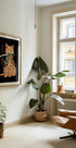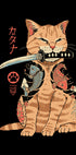 Odvážné a hravé umělecké dílo Vincenta Trinidada zobrazující potetovanou samurajskou kočku s katanou v tlamě. Tento design inspirovaný Japonskem kombinuje tradiční motivy tetování koi s moderní popkulturou, což z něj dělá jedinečný kus nástěnného umění pro milovníky koček a fanoušky japonské estetiky.